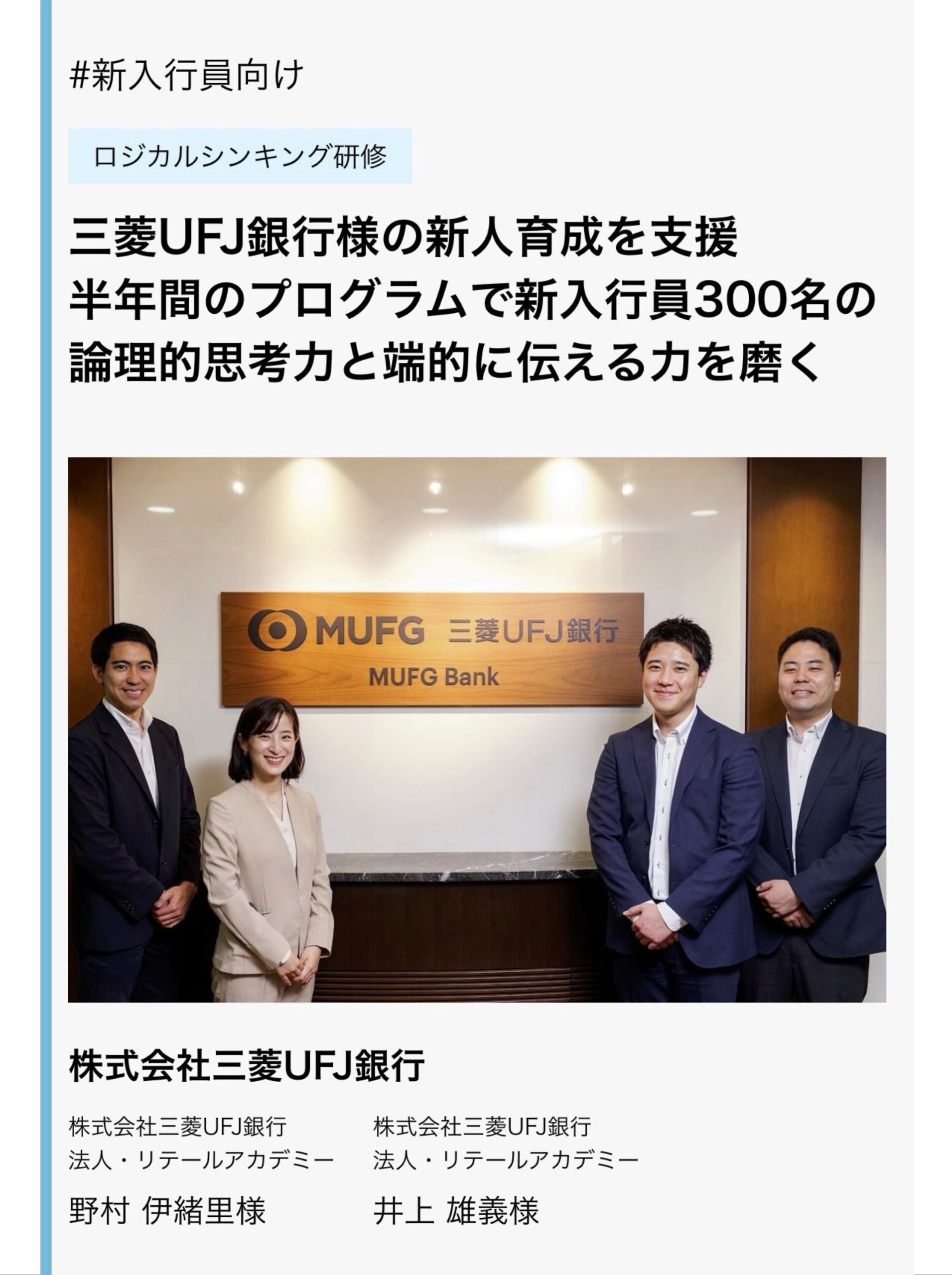 今回は、三菱UFJ銀行様と開発・実施した、新入行員向けロジカルシンキング・コミュニケーション研修をご紹介します。